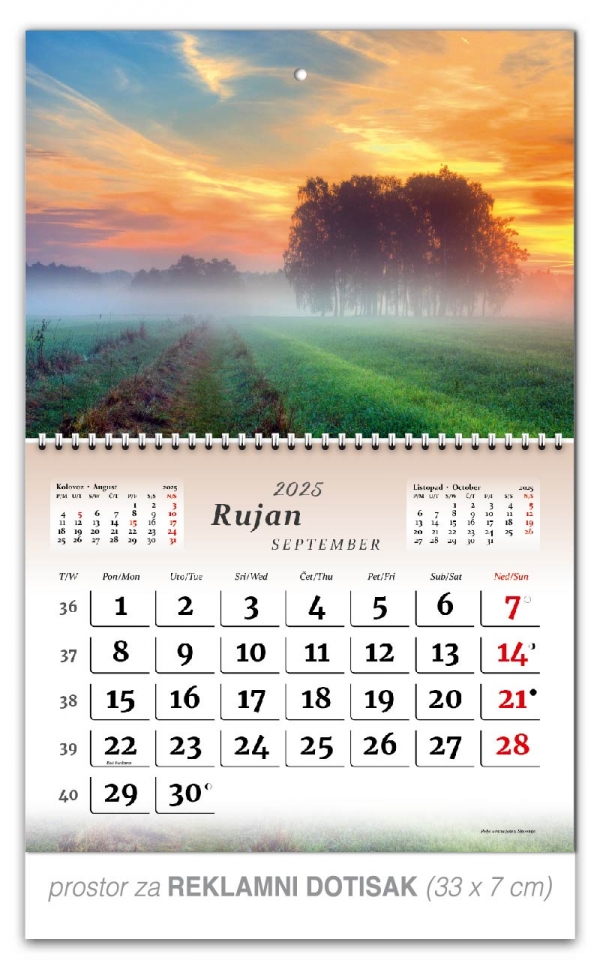 Preklopne zidne kalendare nudimo u 5 motiva. Osim tekućeg mjeseca na jednom listu kalendara, nalaze se prethodni i sljedeći mjesec, a obilježava ga preklopni spiralni uvez po sredini kalendara. Ta vrsta kalendara je praktičnija za slanje poštom. Dotisak vašeg logotipa i/ili vaših podataka na svaku stranicu rotacijskog kalendara, nije uračunat u cijenu, ali smo Vam u mogućnosti ponuditi isto.