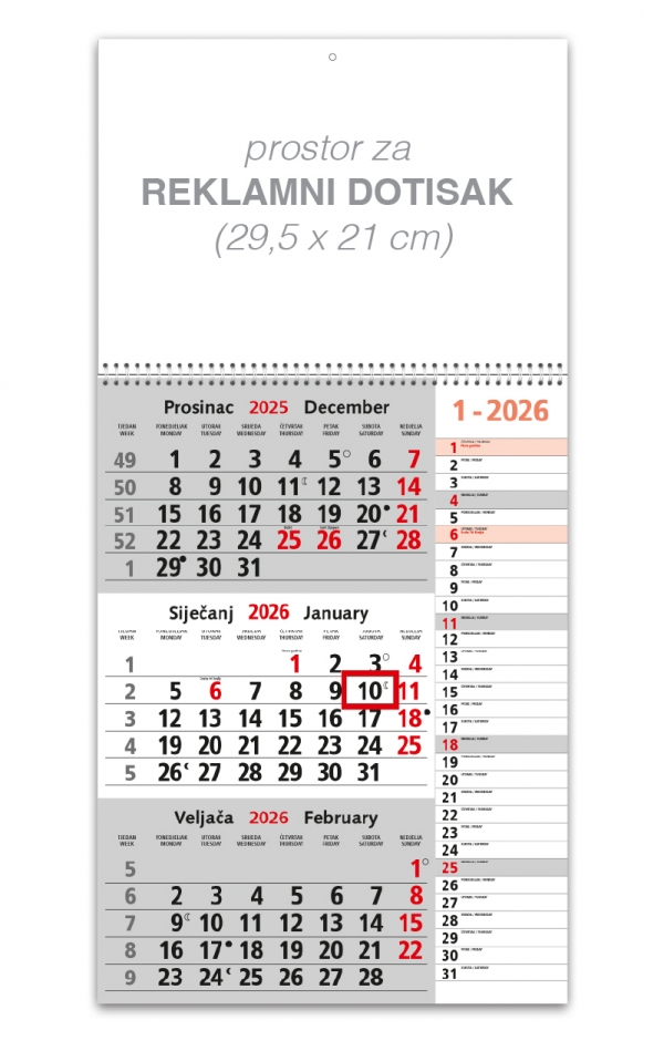 Tromjesečni kalendari su vrlo funkcionalni, jer na istom listu imamo uvid u prethodni, tekući i naredni mjesec. Razlikujemo tromjesečne kalendare po tome dali su ta tri mjeseca na jednom ili na tri odvojena lista. Dotisak Vašeg logotipa i/ili vaših podataka na zaglavlje trodjelnog kalendara nije uračunat u cijenu, ali smo Vam u mogućnosti ponuditi isto.