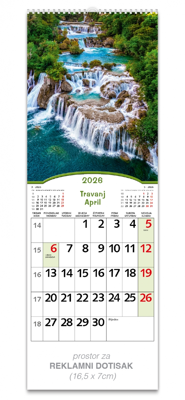 U ponudi imamo 2 motiva uskih okomitih kalendara. Nadamo se da ćete pronaći uski okomiti zidni kalendar koji odgovara baš Vašim potrebama. Dotisak vašeg logotipa i/ili vaših podataka na pasicu uskog okomitog kalendara nije uračunat u cijenu, ali smo Vam u mogućnosti ponuditi isto.